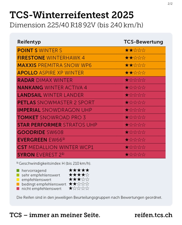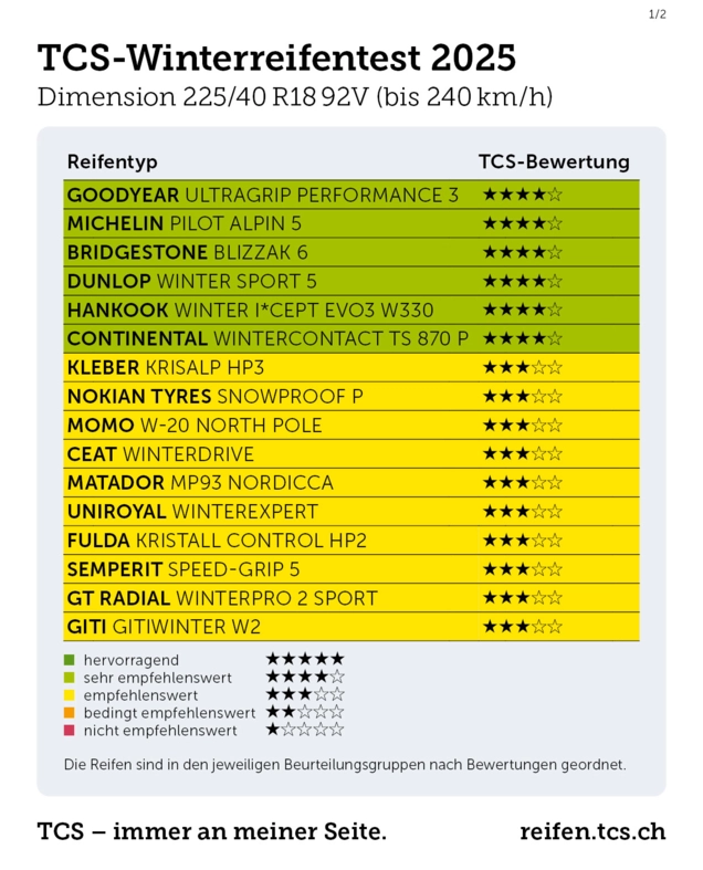 Mit dem Einbruch der kalten Jahreszeit ist es Zeit, das Fahrzeug mit Winterreifen auszurüsten. Um die Automobilistinnen und Automobilisten bei der Wahl zu unterstützen, hat der Touring Club Schweiz 31 Winterreifen der Grösse 225/40 R18 92V getestet. Mehr als ein Drittel der geprüften Reifen hat die Tests nicht bestanden und gilt als nicht empfehlenswert. Alle nicht empfohlenen Modelle sind die günstigsten im Test. Auf nasser Fahrbahn können die Bremswege der schwächsten Modelle um mehr als 15 Meter länger ausfallen – ein potenziell tödliches Risiko.